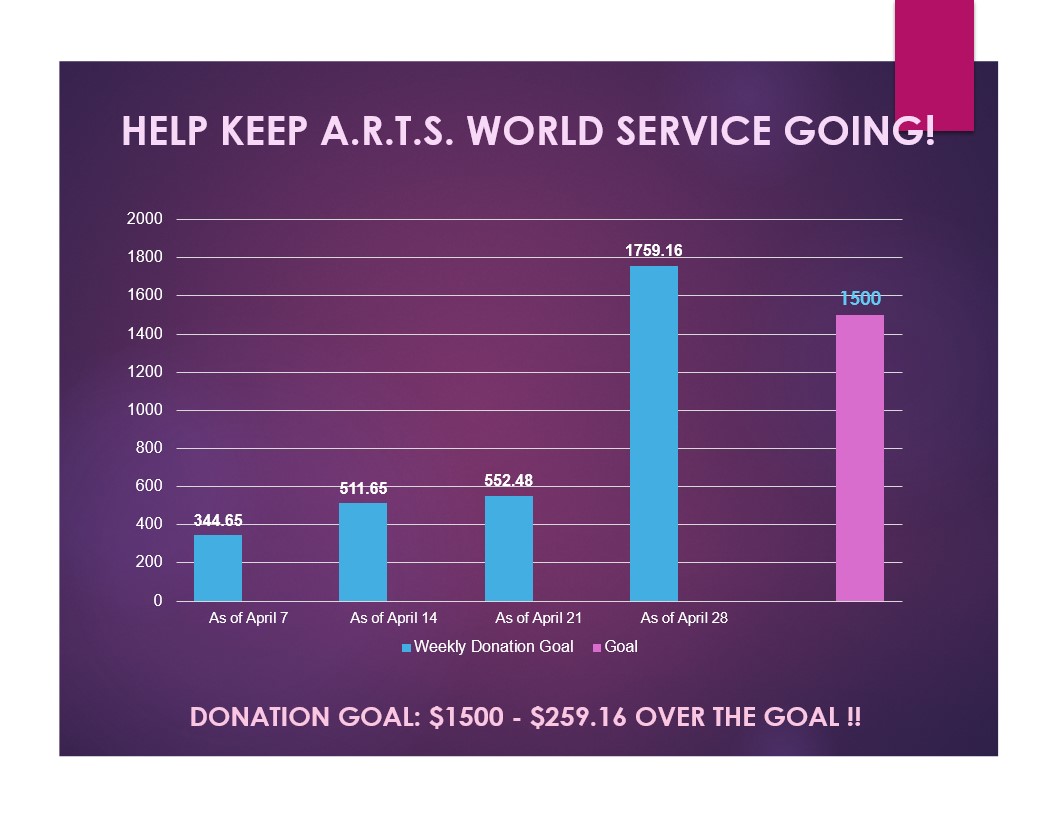 A.R.T.S. Anonymous began in November 1985 as a program of recovery based on the 12 Steps of Alcoholics Anonymous. A.R.T.S. members use the program to discover and find solutions to their artistic blocks. In recovery members take actions to transform hopes and dreams into reality.