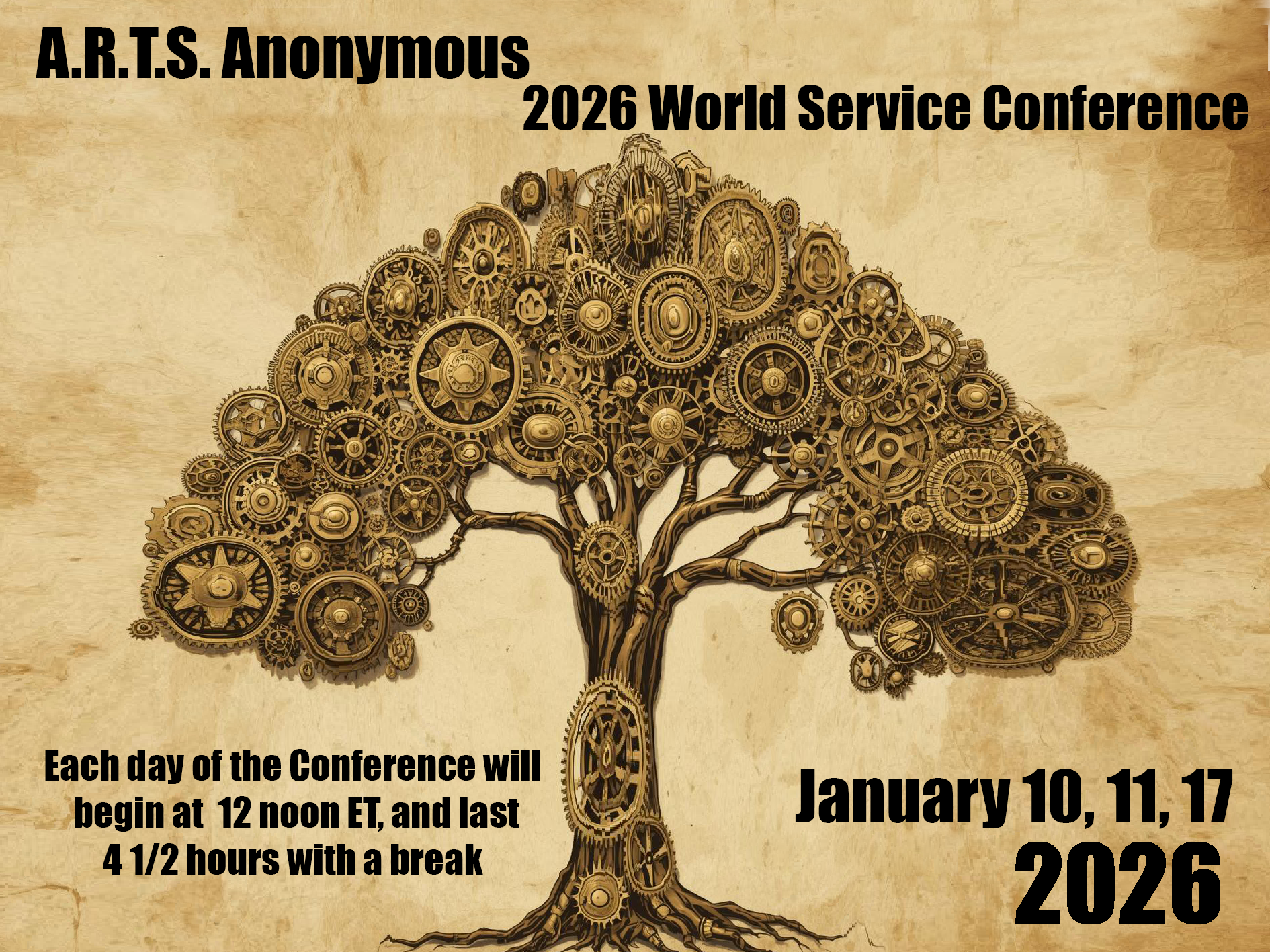 The dates of the upcoming virtual World Service Conference of A.R.T.S. Anonymous are January 10, 11 and 17, 2026. Each day of the Conference will begin at 12 noon and run for 4.5 hours including a half-hour break. The World Service Conference is where decisions and actions are taken for the benefit of A.R.T.S. as a whole. Meetings send Delegates (and Alternate Delegates) to represent the group conscience for World Services. Registration will be available soon.